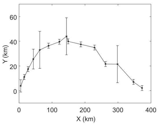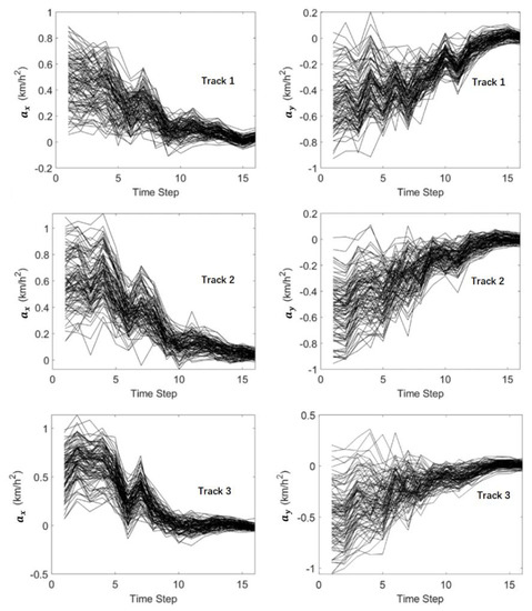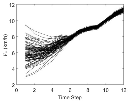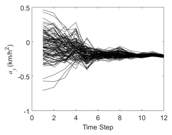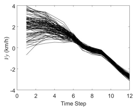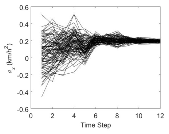 Although the predicted value of the acceleration value in Equation (27) is tentatively set to the acceleration value at the previous time, this acceleration is continuously corrected in the EnKF update step. After obtaining the predicted state vector , Equation (20) can be used to update the .
