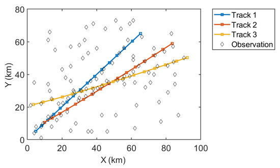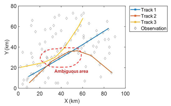 6], etc.). Take the JPDA algorithm as an example—firstly, multiple track hypotheses are generated in the JPDA, and then the probabilities of the hypotheses are calculated, and the assignment hypotheses of each track are merged. This means that the track states are updated by all the measurements within a track gate. Overall, these methods cannot appropriately manage the appearance or disappearance of tracks and make a so-called “hard” decision on the current observation scan in cases of conflicting measurements to track association hypotheses.
