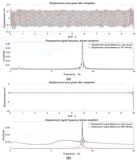 Figure 19 is a comparison diagram of a displacement signal based on FFT+EMD filtering and a displacement signal based on frequency domain filtering. The displacement results obtained by the two as a whole were almost coincident. However, within 0–1 s, due to the end effect caused by EMD decomposition, the displacement signal based on FFT+EMD filtering had a small amplitude signal distortion.