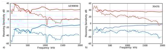 (a) Laser interferometric calibration results of Matsuda et al. [34,35]. NW (solid curve) and RW (dash curve) receiving sensitivities for AE900M sensor. Upper red curves are for the velocity sensitivity and the lower blue curves are for the displacement sensitivity. (b) 5045S sensor. Sensor types were identified with the assistance of the lead author, Y. Matsuda.