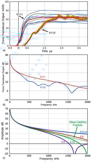 The observed agreement of FFT spectra of GC fracture and the cosine bell function suggests that the rise time value of 0.75 µs is the appropriate rise time, rather than 0.5 µs value from Figure 5a, which can be due to an intermediate step in fracture. This also is close to the rise time of 0.62 µs predicted from the longitudinal wave and crack velocities in glass. For sensor calibration, rise time effects between 0.62 and 0.75 µs are less than 2 dB below 1.5 MHz, but this issue must be examined further using other experimental methods, including laser interferometry, in order to improve the basis of sensor calibration.
