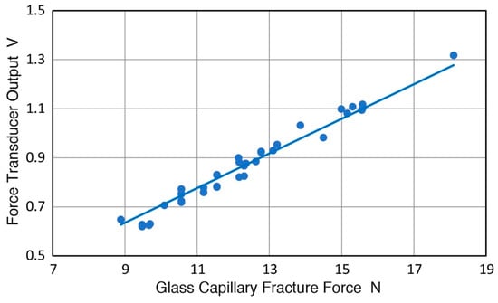 The output voltage from a force transducer (V112) vs. fracture force of GC tubes of 0.36 mm diameter.
