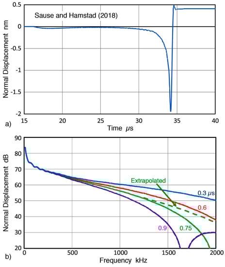 Calculated and verified surface normal displacements from a GC fracture are shown in Figure 7a. This displacement vs. time curve is from the FEM study of Sause and Hamstad [23] and for the case of aluminum medium at 100 mm distance from the GC tube fracture point. The cosine bell source function with the applied force of 10 N and the rise time of 0.3 µs were used, resulting in approximately 2 nm peak displacement. They calculated the displacements in the surface normal direction for steel, aluminum and a polymer at 100 mm distance from the point force, but only the steel results were published. This aluminum data was one of their unpublished results. Its power spectrum from FFT is plotted by a blue curve in Figure 7b. Also plotted in Figure 7b are modified versions using longer rise times of 0.6, 0.75, and 0.9 µs. This modification used the spectral differences of longer rise time cosine bell functions (Equation (1)). As was the case in Figure 5c, longer rise times produce steeper reduction with increasing frequencies above 0.5 MHz. This result points to a general trend, that is, the low frequency part of the displacement spectrum is less sensitive to the rise time increases. Thus, this part can scale the sensitivity levels when the rise time is uncertain since the applied force can be determined independently. Effects of windowing in FFT appear again for the rise times of 0.75 and 0.9 µs. An extrapolated correction is given as green dash curve for 0.75 µs rise time.