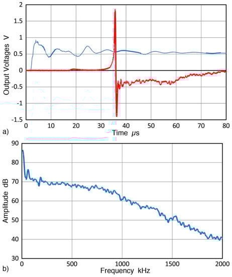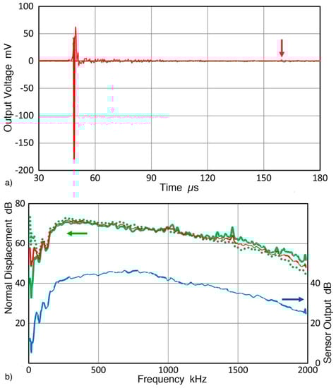 (a) RW pulses from angle beam ultrasonic transducer source received with a reference sensor, KRNBB-PCP. (b) The averaged spectrum of six received RW pulses (lower blue curve with right scale; 0 dB at 1 V). Also shown are the normal displacement spectrum of the RW pulses at the sensor position, (left scale; 0 dB at 1 nm). Green curve for KRNBB-PCP with waveform in Figure 10a, and green dot curve for KRNBB-PC. The averaged displacement spectrum is shown as red curve.