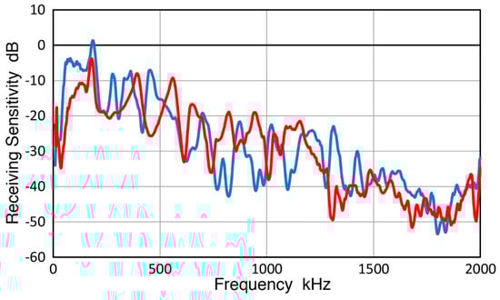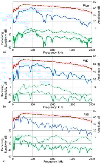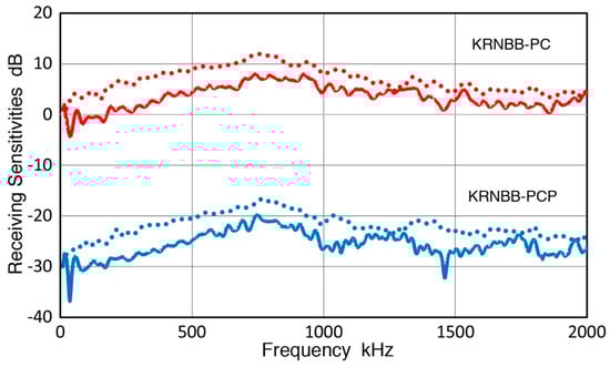 Corrected GW receiving sensitivities of reference KRN sensors are shown with red curves in Figure 13. For both sensors, RW and GW sensitivities are comparable below 100 kHz, but GW values became lower at higher frequencies, the differences reaching 15 dB at 2 MHz. NW sensitivities were always higher than both RW and BW values (except for a GW peak at 50 kHz).