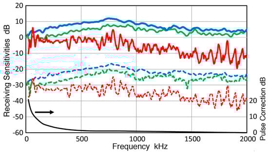 Receiving sensitivities of reference KRN sensors to three wave modes, NW (blue curves), RW (green curves) and other guided waves (GW, red curves). NW and RW sensitivities are from Figure 9. Previous GW receiving sensitivities [28,29] were corrected using spectral difference of two-pulse shapes, shown by black curve (use the right scale). Solid curves for KRNBB-PC and dash curves for KRNBB-PCP sensors. Use the left scale for all curves in color.