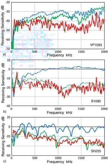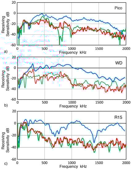 Figure A2 shows receiving sensitivities of three AE sensors, µ30D, S9220, and HD50 (all from Physical Acoustics), to three wave modes—NW (blue curves), RW (green curves), and GW (red curves). These three are smaller in size compared to the preceding three sensors and show less spread among the three receiving sensitivities and a good match between RW and GW sensitivities. These spectra were also closer to those of NW sensitivities than in Figure A1.
