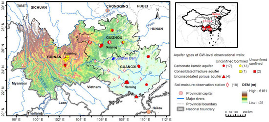 - Huang, Z.; Yeh, P.J.F.; Pan, Y.; Jiao, J.J.; Gong, H.; Li, X.; Güntner, A.; Zhu, Y.; Zhang, C.; Zheng, L. Detection of large-scale groundwater storage variability over the karstic regions in Southwest China. J. Hydrol. 2019, 569, 409–422. [Google Scholar] [CrossRef]