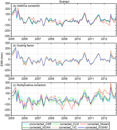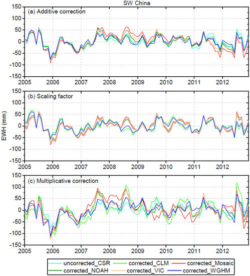 - Long, D.; Yang, Y.; Wada, Y.; Hong, Y.; Liang, W.; Chen, Y.; Yong, B.; Hou, A.; Wei, J.; Chen, L. Deriving scaling factors using a global hydrological model to restore GRACE total water storage changes for China’s Yangtze River Basin. Remote Sens. Environ. 2015, 168, 177–193. [Google Scholar] [CrossRef]