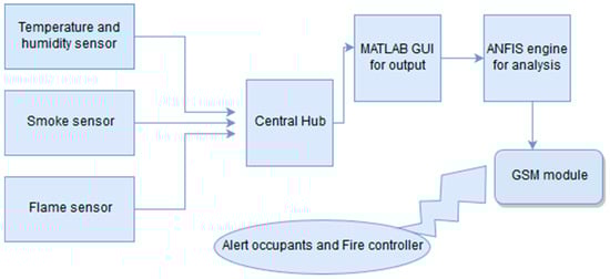 The architecture of the proposed fire detection and warning system is illustrated in Figure 2. The combination of software and hardware together create an automatic fire detection system. The system has different sensors such as a smoke sensor, temperature and humidity sensor, and a flame sensor. These sensors collect data from sensor nodes and then transmit it to the GUI in MATLAB. The data gathered from sensors is then provided as a raw data to fuzzy logic as a linguistic variable which is trained in adaptive neuro-fuzzy system to detect fire status. If the parameters show that the probability of fire is critical, then a message will be sent through GSM regarding the fire condition to the fire controllers and the house owner.