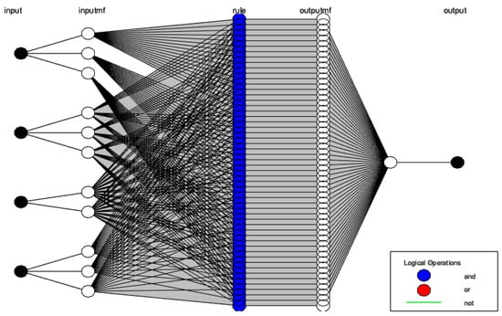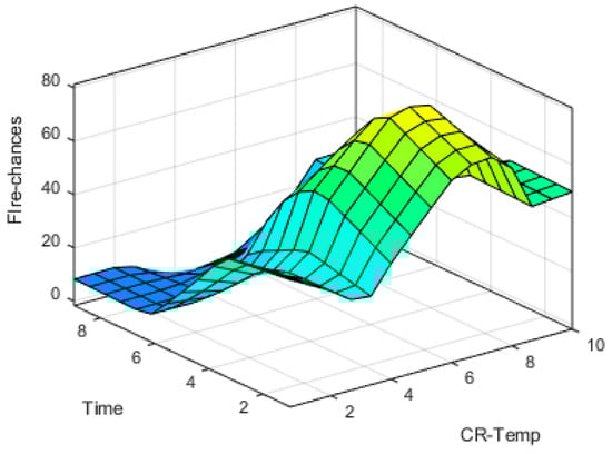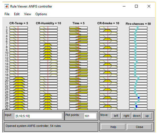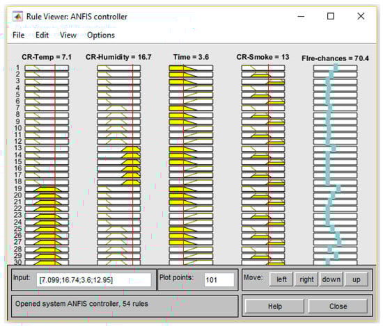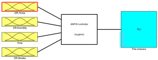 The ANFIS structure model is illustrated in Figure 7. It has five layers. The input layer called layer 0 is not part of the five layers. The presented system has four inputs (CR-temperature, CR-humidity, Time (the rate at which input changes), and CR-smoke).