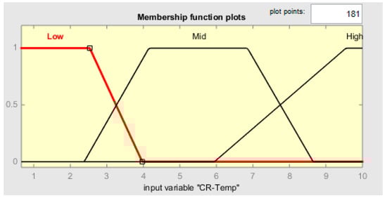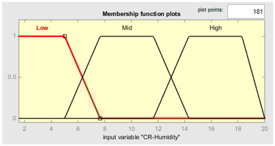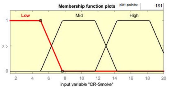 Each membership function plot is given in Figure 9, Figure 10, Figure 11 and Figure 12, respectively, for CR-temperature (change rate of temperature), CR-humidity, CR-smoke, and Time variations.