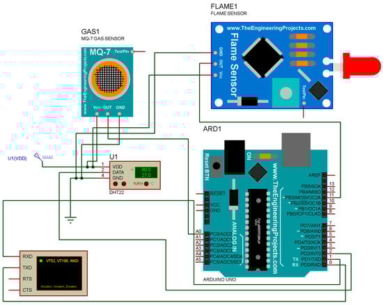 The simulation of hardware used in the proposed system is done in Proteus 8.1 using DH22 as a temperature and humidity sensor; for gas concentration, an MQ7 CO detector sensor is used. A flame sensor is also shown in Figure 14. A schematic diagram drawn in Proteus is shown in Figure 14 and is used for simulation for real-time values to further test the performance of a hardware module.