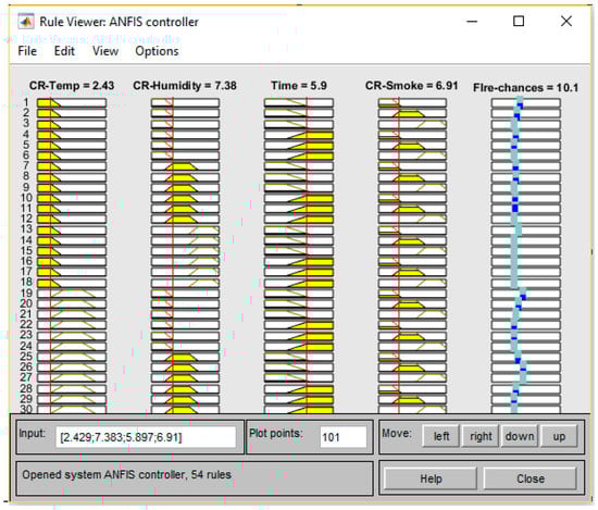 The raw data given as input is then converted into the desired output using the ANFIS technique. ANFIS weighted that input data and mapped it to output for fire detection; in real-time, the smart fire detection and monitoring system is combined with fuzzy interference and neural network. The four vital inputs are checked using the Gaussian form of membership functions. The developed fuzzy interference model is shown in Figure 8.