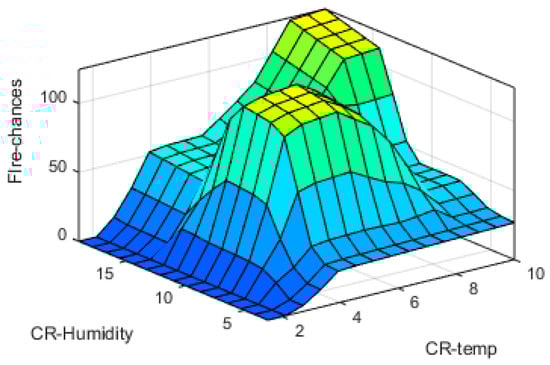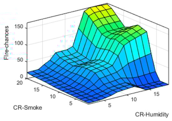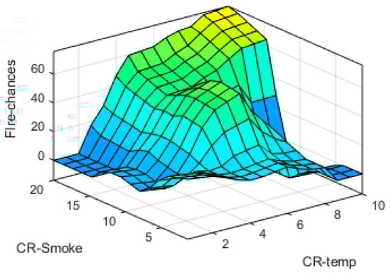 The input-output fuzzy membership functions are analyzed in detail. The generated 3D graphs show the variation of fire chances with reference to the changes in different parameters at input sides such as variation with temperature and humidity, time and humidity, smoke and temperature, and smoke and humidity are shown in Figure 19, Figure 20, Figure 21 and Figure 22, respectively.