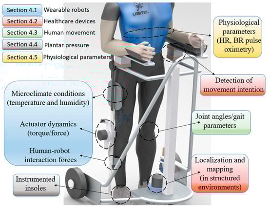In order to achieve their functionalities, exoskeletons highly rely on sensor systems, which are generally potentiometers and encoders for the joint angles assessment that have to be carefully attached to the device’s joints due to their sensitivity to misalignments [25]. For this reason, these sensors need mechanical supports precisely attached to the robot, which result in a less compact system [54]. Another commonly employed sensor technology is based on inertial measurement units (IMUs), but they need regular calibration [55]. In addition, the high sensitivity to electromagnetic fields can be regarded as an important disadvantage in wearable robots applications in which electric actuators are constantly activated [54]. Similarly, the electronic strain gauges employed in the assessment of human–robot force/torque interaction and actuator dynamics also have sensitivity to electromagnetic fields, need frequency calibration, and require a careful attachment to the structure, where the strain/force will be measured [56].