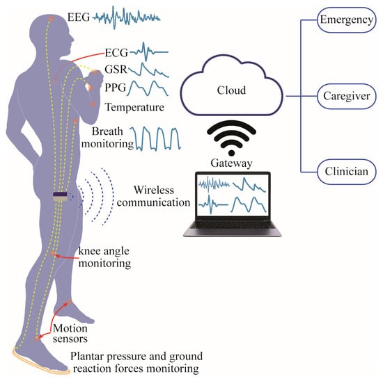 All the aforementioned sensors can be integrated in architectures for remote health monitoring, where all the data acquired by the sensors can be transmitted from a personal or home gateway to a remote database or to the cloud using a secured connection [67]. In addition, all the data can be processed and then transmitted to the healthcare provider [21]. For this reason, issues related to interoperability and integration have been studied, as summarized in reference [77]. However, it is important to note that these issues can be reduced if the multiplexing capabilities of optical fiber sensors are considered. In this case, all the information will be transmitted using a single optical fiber cable, which not only reduces the issues regarding integration and interoperability when a system with different sensors is used, but also reduces the size of the system as well as the number of components for data acquisition and transmission. Aiming at this background, eHealth architectures using optical fiber sensors have already been proposed [78]. Figure 3 presents an overview of the architecture using conventional sensors for health assessment with the data transmitted to the cloud. In this example, the sensors include electroencephalogram (EEG) for the assessment of the cerebral signs, electrocardiogram (ECG) for assessment of the cardiac conditions, sensors for galvanic skin response (GSR), as well as conventional sensors for temperature, angle, motion, plantar pressure, and breathing monitoring.