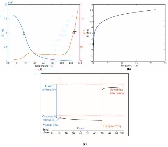 Typical response curves from POFs. (a) Temperature response with storage modulus (E’) and loss factor (tanδ), (b) Frequency response, and (c) Creep response indicating the viscous and elastic part of the polymer response.