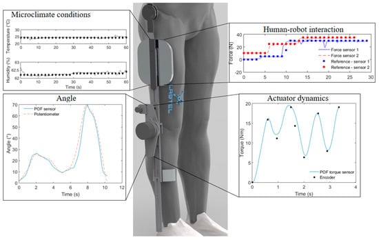 The human–robot interaction force was also assed during the gait in reference [154]. In this case, by taking advantage of the POF flexibility and compactness, a novel 3D-printed POF-embedded instrumented shank support for exoskeletons was proposed. The support is made with the 3D-printing performed directly on the fiber, where the proposed system showed not only the capability of measuring human–robot interaction forces in different protocols (seated flexion/extension cycles and gait cycles), but also in different devices, where the proposed 3D-printed support was positioned on a lower limb exoskeleton and on a passive orthosis for knee stabilization during the gait. Furthermore, since the proposed shank support is in direct contact with the user’s legs, additional POF sensors were added in order to measure the human–robot interaction forces and the temperature and humidity conditions in the interface between the device and user’s legs. Thus, the system proposed in reference [154] provides a direct multiparameter measurement of the forces and microclimate conditions of the user and can be employed in different devices.