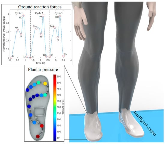 The monitored parameters for human health assessment include foot plantar pressure, which provides important data regarding the human health condition [59]. With the plantar pressure assessment, it is possible to obtain a foot pressure distribution map, which plays an important role on the monitoring of foot ulcerations (of particular importance for diabetes patients). In addition, foot pressure maps enable measurements of foot-function indexes such as arch index, which provide the evaluation of the arch type of each individual that is also related to injuries in runners [60].