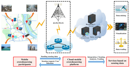 Inspired by the current popular smart city testbeds [4,5], a typical mobile crowdsourcing platform was proposed. As shown in Figure 1, the mobile crowdsourcing system consists of a large group of crowdsourcing participants distributed in a specific area and a crowdsourcing platform in the cloud, which is connected by mobile network or WiFi. Crowdsourcing participants(a.k.a, Users) use smart devices for road condition monitoring [6], pollution monitoring [7], location services [8], natural disaster assessment [9], etc., and send sensing data to crowdsourcing platforms. However, users consume their resources in performing tasks, such as batteries and computing power. Due to the diversity of individuals and smart devices, the cost of performing tasks is not the same. So they need to get different rewards from crowdsourcing platforms to continue their cooperation. Crowdsourcing platform provides a centralized management platform for sensing data receipt, integration, cleaning, analysis, and further building applications of interest, such as data mining, visualization and data trading, etc. In addition, the crowdsourcing platform has the right to publish tasks and select users.