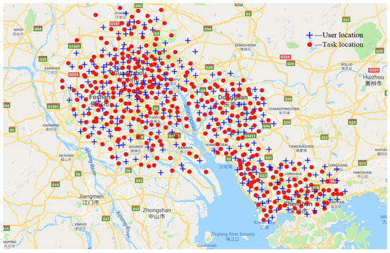 Real-world data: To evaluate the performance of the GRASP-AR algorithm, we used a task assignment data set [42] published by the China Society for Industrial and Applied Mathematics, which contains 835 tasks and 1877 users from four Chinese cities (i.e., Guangzhou, Foshan, Shenzhen and Dongguan). The distribution of task locations and user locations are shown in Figure 2. In the experiment, we set the parameter = 50 km. In addition, the dataset also provides the reputation of all users, which is scaled to a range of (0, 1). The dataset parameter settings are summarized in Table 3.