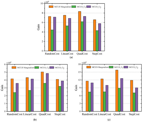To compare the effects of different gain-cost models on user selection, we used LinearGain, QuadGain, StepGain and various cost models on the real-world dataset. As shown in Figure 3, different gain models show the same patterns. Specifically, the user selection scheme () we proposed achieved the highest gain in most cases. Taking Figure 3a as an example to illustrate, is nearly 32% higher than and 9.6% higher than in terms of average gain. This is because costs a lot, and always stops at a fairly low gain. This difference is more obvious in the StepGain model.