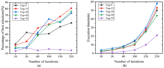 We used LinearGain and RandomCost to find the best selection percentage and running time for different combinations of and k. Figure 6 shows the results of our experiment. We have three conclusions. First, there is no doubt that the more iterations, the longer the time, but the more iterations, the better the results. Second, better results are often obtained when k = 15. This is because if the value of k is too low, the best solution may not be found, and if the value of k is too high, it is close to random search, which will reduce the quality of the results. Finally, when k increases gradually, the running time increases, while k exceeds 50, the running time decreases. This is because when k is large, it is less likely to find a better solution in the construction phase, so there are fewer iterations in the local search phase.