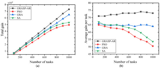 As shown in Figure 7a,b, while all algorithms aim to maximize the gain of the task, GRASP-AR achieves the maximum (total) gain of all tasks and the average gain of each task, respectively. Specifically, GRASP-AR performs approximately 32%, 17% and 14% better than PSO and GRA and SA, respectively. It is no surprise that GRASP-AR provides a good starting point and maintains a variety of solutions in the construction phase, which provides a good foundation for the final user selection. Secondly, the local search phase explores the neighborhood of the solution and further improves the solution. Furthermore, we can see that the SA cannot be extended over a large number of tasks, which significantly reduces the task gain.