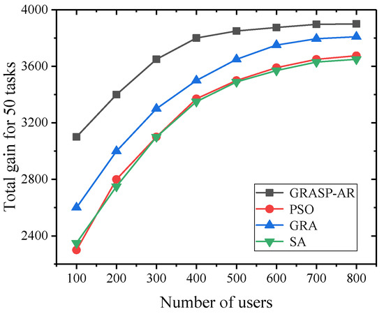 Figure 8 shows the effect of available users on the total gain of 50 tasks. It can be seen that with the increase of the number of potential users, the contribution of the four algorithms to the total gain of 50 tasks is increasing, and their fitting curves are getting closer. This is because the more users in the search space, the more potential users to provide high-quality service, and a better subset of users can be found for the task. It is worth noting that the performance of GRASP is still higher than other algorithms. It is 15.8%, 14.3% and 8.7% higher than SA, PSO and GRA, respectively, in terms of average gain.