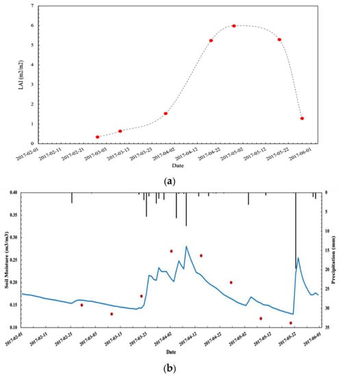 Temporal variations in retrieved leaf area index (LAI) (a) from Sentinel-2 and retrieved soil moisture (SM) (b) from Sentinel-1 at the Raoyang site. Temporal variation in S2 retrieved LAI (red dot) at the Raoyang site. Temporal variation in S1 retrieved SM (red dot) and in situ measurements at the Raoyang site.