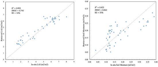Scatterplot of retrieved LAI versus in situ LAI values (left) and retrieved SM versus in situ SM values (right) evaluated in the study area.
