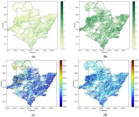 Retrieved LAI and SM maps obtained at two key phenological stages (green-up: (a, c); and jointing: (b, d)) of winter wheat area in the city of Hengshui. (a) Retrieved LAI 29 March 2017. (b) Retrieved LAI 28 April 2017. (c) Retrieved SM 2 April 2017. (d) Retrieved SM 8 May 2017.