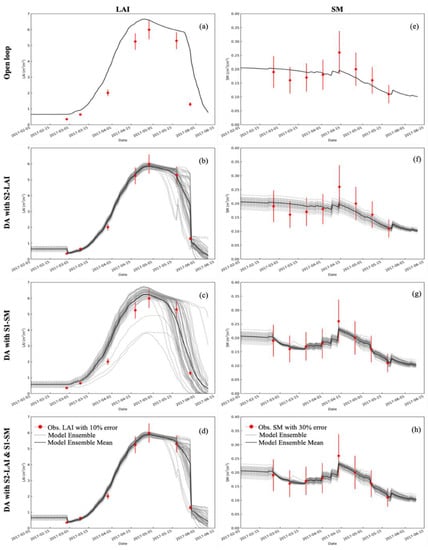 The LAI and SM simulations of the Word Food Studies (WOFOST) with open-loop (a,e), assimilation of S2-LAI (b,f) and S1-SM (c,g) respectively, and joint assimilation of S2-LAI and S1-SM (d,h) at the Raoyang site in 2017.