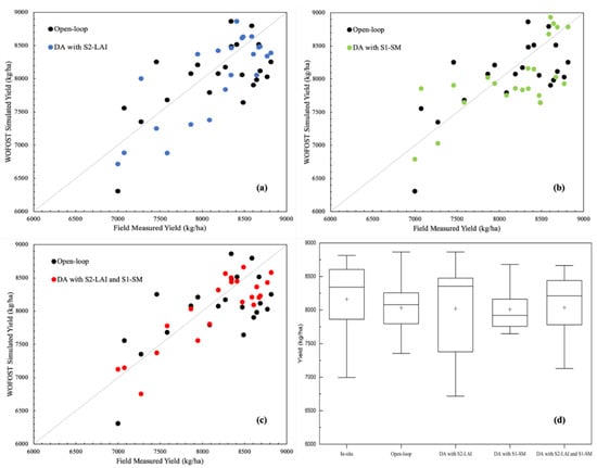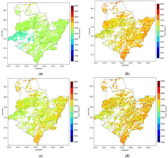 The winter wheat yield simulation with different data assimilation schemes ((a) open-loop; (b) DA with LAI; (c) DA with SM; and (d) DA with SM+LAI). (a) Open-loop, (b) DA with LAI, (c) DA with SM, (d)DA with LAI+SM.