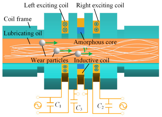 The core structure of the proposed wear particle detector is shown in Figure 1. Differing from the conventional wear particle detection sensor, which only includes a coil frame, two reverse exciting coils, and an inductive coil, the proposed particle detector adopts the resonance principle and an amorphous iron core to compressively improve its sensitivity. Based on the features of the sensor, the parallel resonance topology is used for the exciting coil to boost the impedance change of the coil caused by particles. Moreover, the series resonance principle is applied to the inductive coil to improve the induced electromotive force. Therefore, the resonant capacitors C1 and C3 are connected to the left and right exciting coils of the sensor in parallel, and the resonant capacitor C2 is connected to the inductive coil in series. The general working principle of the sensor has been expounded in Reference [22]. In order to achieve the flow requirements of wear monitoring for large-scale machines, the inner diameter of the sensor is set to 7 mm.