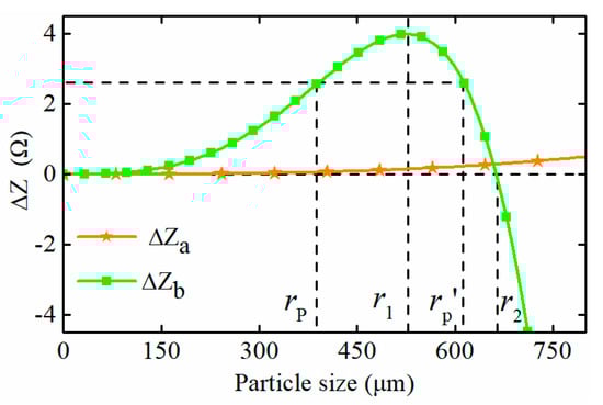 To characterize the sensitivity of the two sensors, the impedance differences between the exciting circuits of each sensor are calculated by MATLAB (MathWorks, USA) and shown in Figure 3. During the calculation, the equivalent inductance of the exciting coils is , which is obtained from experimental measurement, the exciting frequency is set to , and the corresponding resonant capacitances are . It can be seen that for the sensor with a non-resonance principle, the impedance difference slowly grows with the increase of the particle diameter, and that it is merely 0.41 Ω when the diameter of the ferromagnetic particle is 750 μm. However, for the sensors with resonant exciting coils, the impedance difference rises rapidly with the increase of particle diameter, reaches a peak value (3.99 Ω) at the position of r1 (528 μm), and then decreases sharply. Therefore, the obvious impedance difference between the exciting circuits of the proposed sensor signifies that the parallel resonant exciting coil does improve the sensitivity of the sensor to a certain extent. However, the nonlinear characteristics of the impedance difference mean that different sized particles, such as the particles with the diameter of and , may lead to the same impedance change, and even the impedance change, caused by the particle larger than in diameter, turns negative, which means that the large ferromagnetic particle may be recognized as a non-ferromagnetic particle. Therefore, for correctness of the particle detection result, the effective detection range of the proposed sensor is restricted to (0,).