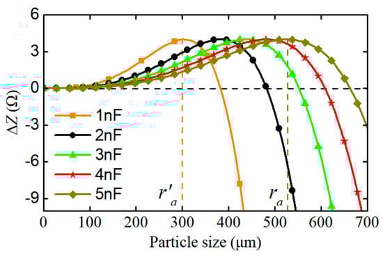 To effectively monitor the initial abnormal wear stage of the machinery, some measures must be taken to improve the detectability for micro particles. It is calculated that for the proposed sensor, the resonance capacitance (or resonance frequency) greatly affects the peak position of . The impedance differences between the two exciting circuits with different resonance capacitors are displayed in Figure 4. It can be seen that with the decrease of the capacitance, the impedance difference curve shifts to the left, which reduces the particle detection range of the sensor to , but enhances the impedance difference between the two exciting circuits caused by micro particles. Therefore, the smaller resonance capacitance (higher resonance frequency) contributes to the detection of micro wear particles. However, that greatly increases the current through the exciting coils and makes the sensor produce more heat, which is harmful to the reliability of the sensor. Meanwhile, the excessive field frequency increases the magnetic losses in particles, which weakens the detectability for ferromagnetic particles. Considering the above factors, a real well-selecting experiment was conducted, and the results showed that a resonant capacitance of 1nF is appropriate for the detection of ferromagnetic particles. In this situation, the detection range of the sensor was restricted to (0, 300) μm.