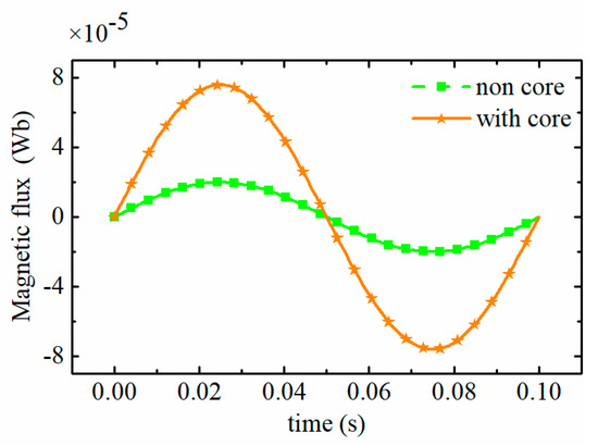The combination of (3) and (11) implies that the parallel resonant exciting coil can essentially improve the induced electromotive force. Meanwhile, Equations (2) and (3) indicate that increasing the magnetic flux through the inductive coil is helpful to further enhance the detectability for micro wear particles and boost the sensitivity of the sensor. Therefore, an amorphous iron core is added to the inductive coil. For the inductive coil, the difference in the magnetic flux density between the two exciting coils can be equivalent to a weak external magnetic field , which produces the magnetic flux of the inductive coil. Based on the equation of , it can be obtained that a ferrite core with a high permeability can boost the external magnetic field and enhance the magnetic flux of the inductive coil. To demonstrate the enhancement effect of the magnetic flux by the amorphous core, a simulation was conducted using the software of COMSOL Multiphysics (COMSOL, Stockholm, Sweden). The simulation parameters used were obtained from the experimental system (illustrated in Section 3). The magnetic fluxes of the inductive coil caused by a 100 μm iron particle for the sensors are displayed in Figure 5. It can be seen that the magnetic flux through the inductive coil of the sensor with the amorphous core increases significantly. In this case, a larger induced electromotive force is produced by the inductive coil.
