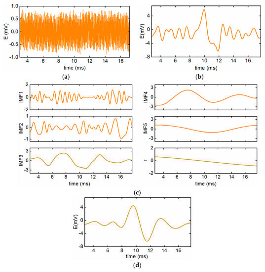 The simulation is conducted on the condition that the effective particle signal is , SHR equals 1/100, the variance of Gaussian noise is 1e-8, and the signal amplification factor is 100. In this situation, the raw signal of the sensor is demonstrated in Figure 7a, which shows that the particle signal is fully submerged in the interference, and the SNR of the raw signal is as low as –21.37 dB. The preliminarily extracted particle signal is displayed in Figure 7b. It can be seen that the interference component is greatly removed from the raw signal, however, the residual interference still influences the amplitude recognition. In the process of signal-shaping, the preliminarily extracted signal is decomposed into several IMFs and a residual component by the EMD method, as shown in Figure 7c. Based on Equations (21)–(25), the IMF5 and the residual component are regarded as low-frequency trend components and the IMF1 and IMF2 are treated as high-frequency interference. After eliminating all the interference, the reconstructed signal can be obtained, as shown in Figure 7d. It shows that the shaped particle signal has obvious sinusoidal characteristics.