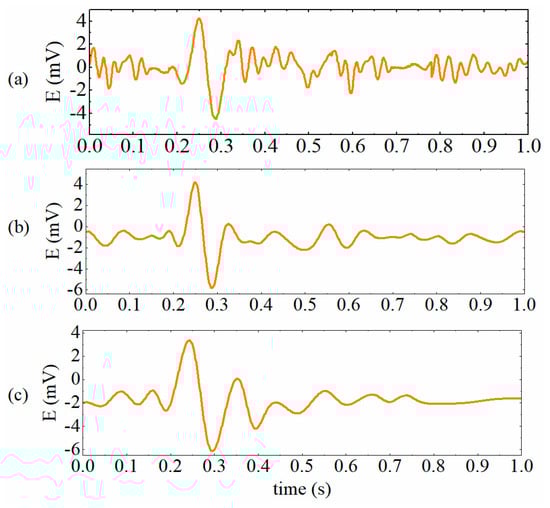 The extraction results of different algorithms applied on the preliminarily extracted signals. (a) resonance-based signal decomposition method and fractional calculus (RSD-FC), (b) variational mode decomposition (VMD)-based method with k = 7, (c) empirical mode decomposition and reverse reconstruction (EMD-RCC).