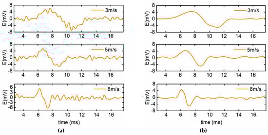 During the experiment, the measurement data shows that the initially induced electromotive forces of the sensors are about V and the Gaussian noise is very apparent. In this case, the particle signal is totally submerged in the inference. Taking the proposed sensor as an example, Figure 10 shows the raw signal of the sensor caused by a particle with the diameter of 120 μm. Because the particle speed may influence the signal extraction effect to a certain degree, particle detection experiments were conducted when the particle moved at the speed of 3 m/s, 5 m/s, and 8 m/s, respectively. The preliminarily extracted particle signal and the shaped particle signal are shown in Figure 11a,b, respectively. The results indicate that for the preliminarily extracted signals, a better detection is achieved at a higher particle speed. Moreover, after the signal shaping, the residual interference is further removed and the signals of the particle with different speeds can be effectively extracted. The SNR and peak-to-peak values of the particle signals are listed in Table 4, which shows that the proposed particle signal extraction method can greatly enhance the SNR of the particle signals and benefit the detection of micro wear particles. In addition, the peak-to-peak values of the signals are approximately consistent, which means that the signal measurement system has high fidelity.