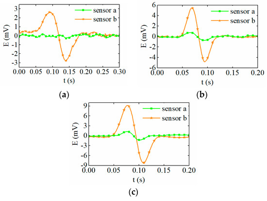 The particle signal output by the sensors. (a) 75 μm, (b) 120 μm, (c) 150 μm.