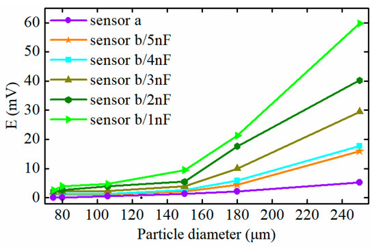 A comparison analysis of the detection result of the conventional sensor and the proposed sensor with various resonant capacitances is presented in Figure 13. It can be seen that the particle signal output by the proposed sensor is much larger than that of the traditional one, and with the decrease of the exciting capacitance, the sensitivity of the sensor gradually increases. The amplitude of the signal caused by a 75 μm iron particle, when the exciting capacitance equals 1 nF, is 2.6 mV, which is much greater than that under the circumstance of (1.06 mV), and the increasing trend tends to be more evident for larger particles. However, excessive reduction of the resonant capacitance leads to a stronger eddy current effect in ferromagnetic particles and increases the current through the exciting coil rapidly, which may weaken the detectability for ferromagnetic particles and greatly reduce the reliability of the sensor. Therefore, a 1 nF resonance capacitance for the exciting coil is finally used for ferromagnetic particle detection.