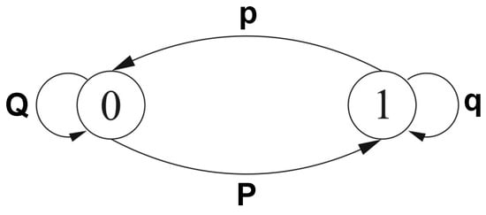 The missing values were created in accordance with a burst Gilbert model that simulates burst-error with a two-state Markov chain (i.e., good as 0 and bed as 1) []. We define P as the probability of transition form state 0 to the state 1 and p the probability of transition from state 1 to 0. Moreover, Q and q give the probabilities of remaining in the same states 0 or 1 (see Figure 1). Using these parameters, it is possible to represent average bit-error rate as showed in Equation (1) and the average burst length () is set at 10.