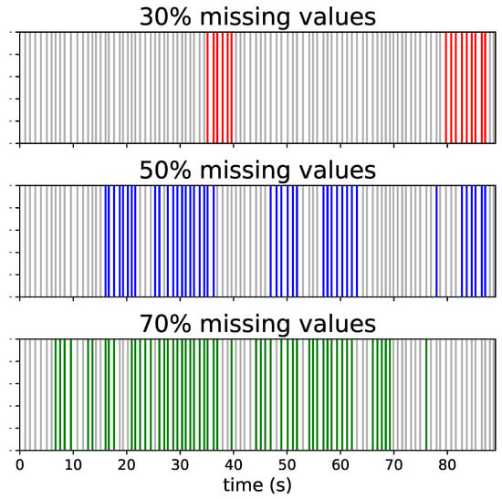 where the is set in accordance with the missing values percentage that we want to add in the time series (e.g., if we want 20% of missing values we set as 0.3). The missing values were introduced in the time series when the state of the two-state Markov chain is equal to 1. Examples of 30%, 50% and 70% of missing values created by Gilbert model are provided in Figure 2.