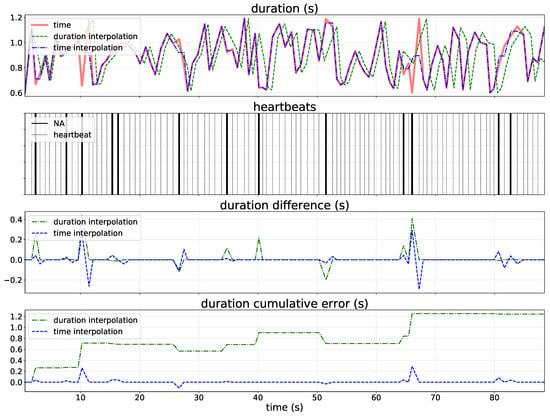 Figure 4 provide more detailed analyses of the difference between linear interpolation on both duration and time. The cumulative error when the missing values are interpolated on duration increases as the time series goes by because it creates RR-intervals in accordance with the closest interval values (i.e., the higher is the number of missing values, the higher is the cumulative error) depending on the interpolation type used (e.g., linear, quadratic and cubic spline). Differently, time interpolation did not introduce change in time series length due to the fact that this approach estimates intermediate values between the time when two observed beats happen in accordance with interpolation type.