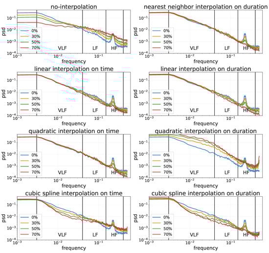 Frequency analysis of a user’s RR-intervals timeseries recorded in 5 min with different percentages of missing values (i.e., 0%, 30%, 50% and 70%) handled with different interpolation methods (i.e., nearest neighbor, linear, quadratic and cubic spline) on both time and duration.