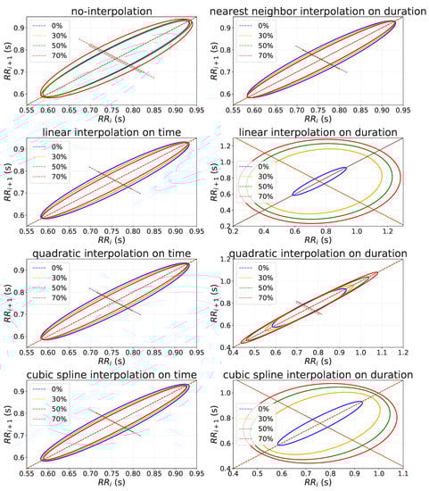 SD1 does not require any interpolation to handle missing values, while SD2 needs quadratic interpolation on time to obtain reliable result (see Table 3). To give an explanation of these results, in Figure 6 we provide an example of the relationship between and (i.e., Poincaré plot) where SD1 and SD2 are extracted. This figure shows Poincaré plots obtained after interpolating missing RR-intervals by using different interpolation method on both time and duration. This figure shows that when the missing values were interpolated on time, the variability of SD1 reduced as the percentage of missing values increased, while the SD2 remain constant. Differently, the interpolation on duration introduce error on both SD1 and SD2 increasing their variability as the missing values increase. Finally, in this figure it can be seen that no-interpolation and quadratic interpolation on time introduced less error compared to the other method on SD1 and SD2, respectively.