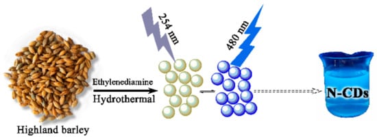 Highland barley contains plenty of carbohydrate and protein; the N-CDs were synthesized by a hydrothermal method at 200 °C for 24 h from Highland barley and ethanediamine as shown in Figure 1. When N-CDs were obtained, under the irradiation of UV light (254 nm) in an aqueous solution, very strong blue luminescence could be seen.
